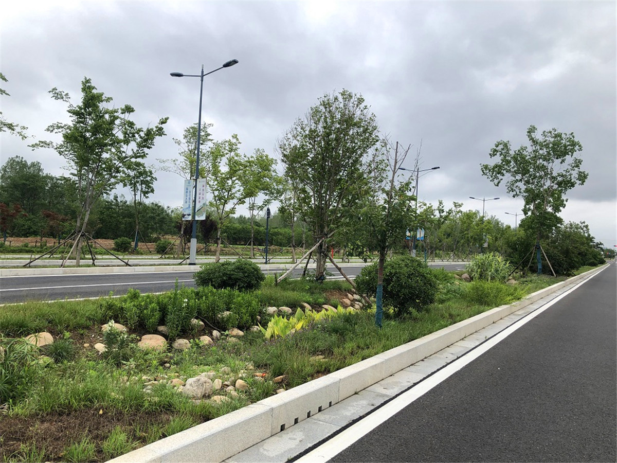 項目介紹:迎春大道為宿遷市湖濱新區(qū)的一條景觀大道,全長2.3km,寬度50m。本項目為宿遷市海綿城市設(shè)計示范道路,中分帶采用自由組團+雨水花園+臺地景觀相結(jié)合的設(shè)計形式,側(cè)分帶和人行道隔離帶采用下凹綠地,紅線外側(cè)綠地在交叉口或人流集中區(qū)域做局部下沉式雨水花園,形成湖濱新區(qū)特色景觀大道。行道樹選用珊瑚樸,側(cè)分帶與人行道隔離帶呈“品”字型種植。在炎熱的夏季起到遮陰納涼效果,而在寒冷冬季落葉后,又為行人提供溫暖的陽光。苗木選擇時結(jié)合海綿城市設(shè)計理念,將水生植物應(yīng)用到道路景觀帶中,成為良好的風(fēng)景線。