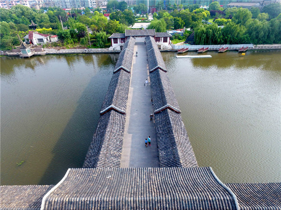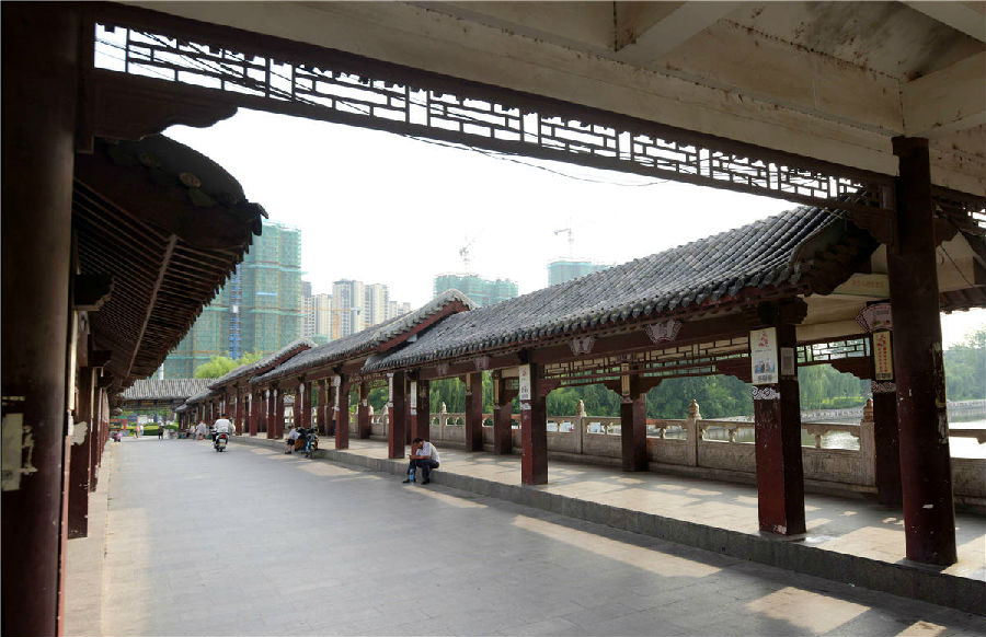 項(xiàng)目介紹:本橋位于故黃河公園內(nèi),橋梁上部采用明、清建筑風(fēng)格的亭廊對(duì)橋梁結(jié)構(gòu)進(jìn)行裝飾,外觀雄偉大方,景觀效果較好,與整個(gè)公園的建筑風(fēng)格相協(xié)調(diào),使橋梁與周圍環(huán)境相補(bǔ)充、相融合,自然和諧,增加了黃河公園的景觀效果。橋梁兩側(cè)人行道設(shè)置的爬山廊,可供行人避雨、遮陽(yáng)、小憩。